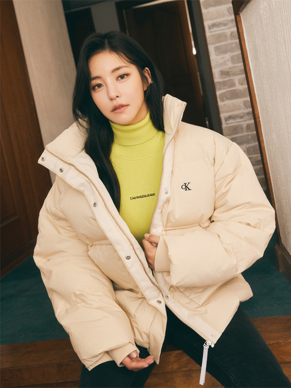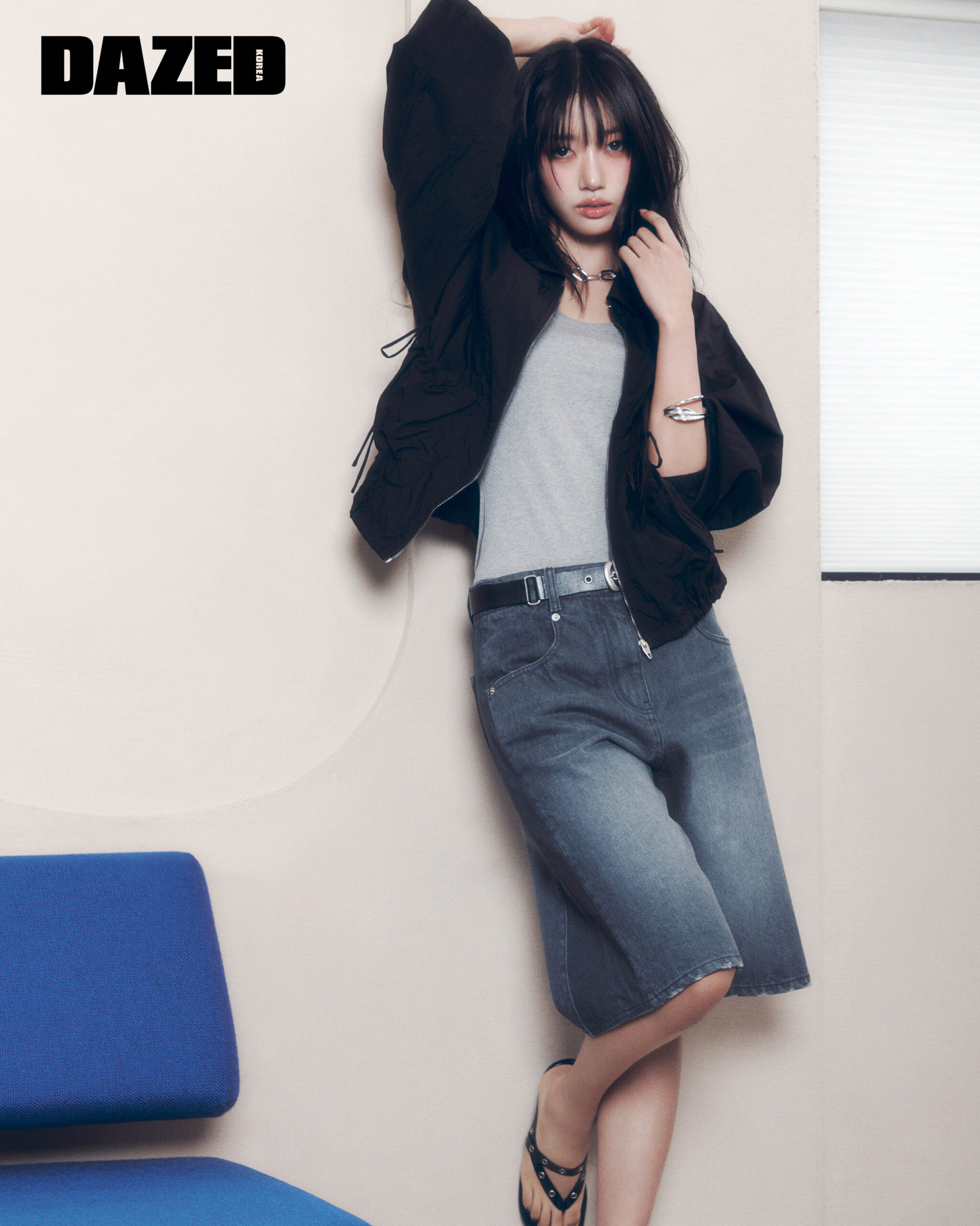 볼륨 실루엣 점퍼와 언밸런스 슬리브리스 톱, 컬러 블록 데님 버뮤다팬츠, 슈즈, 벨트는 모두 구호플러스(kuho plus).