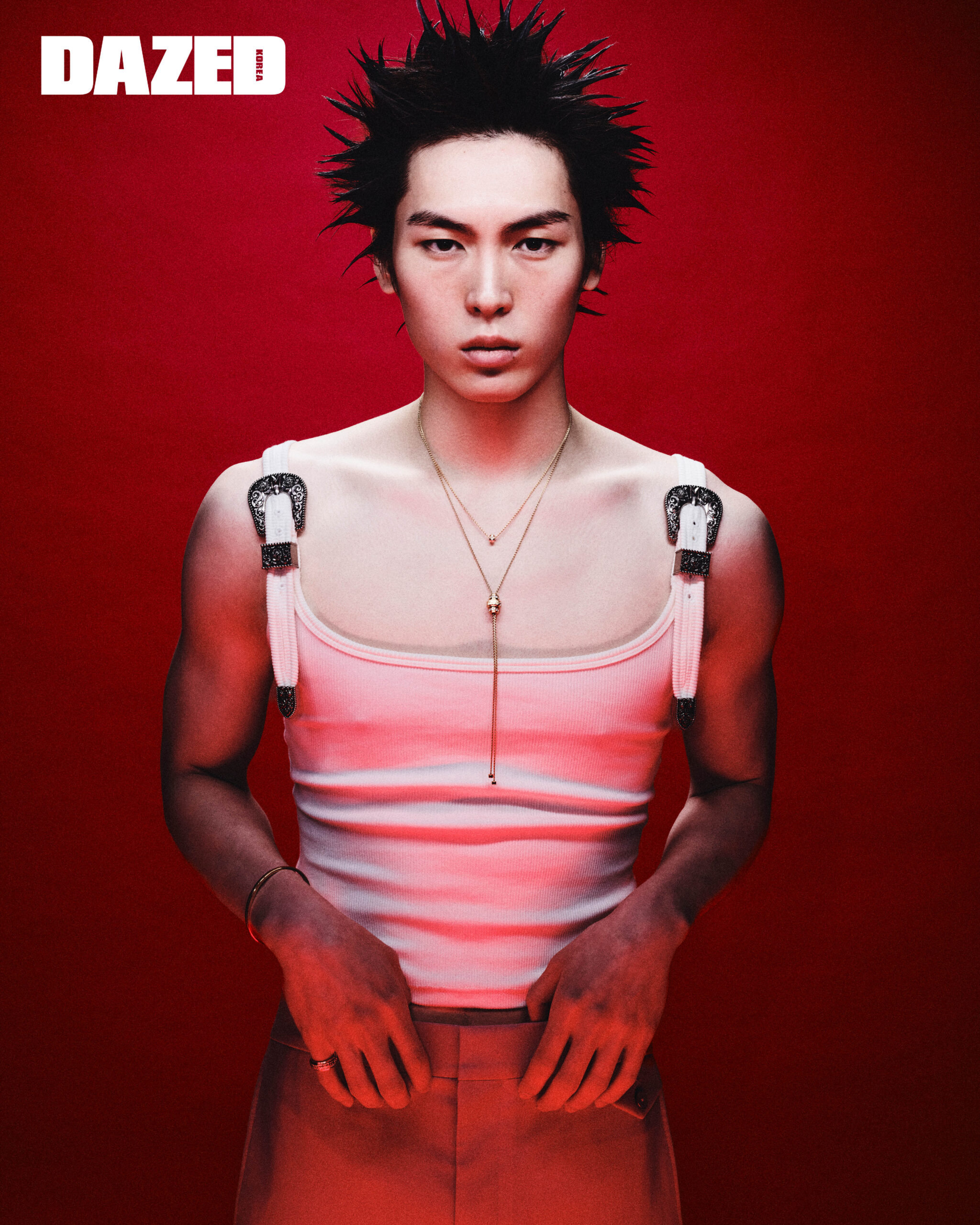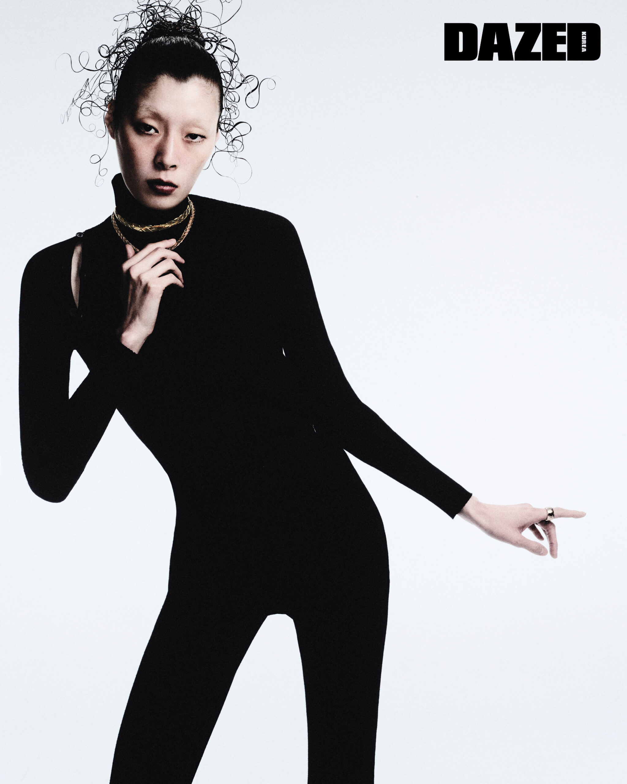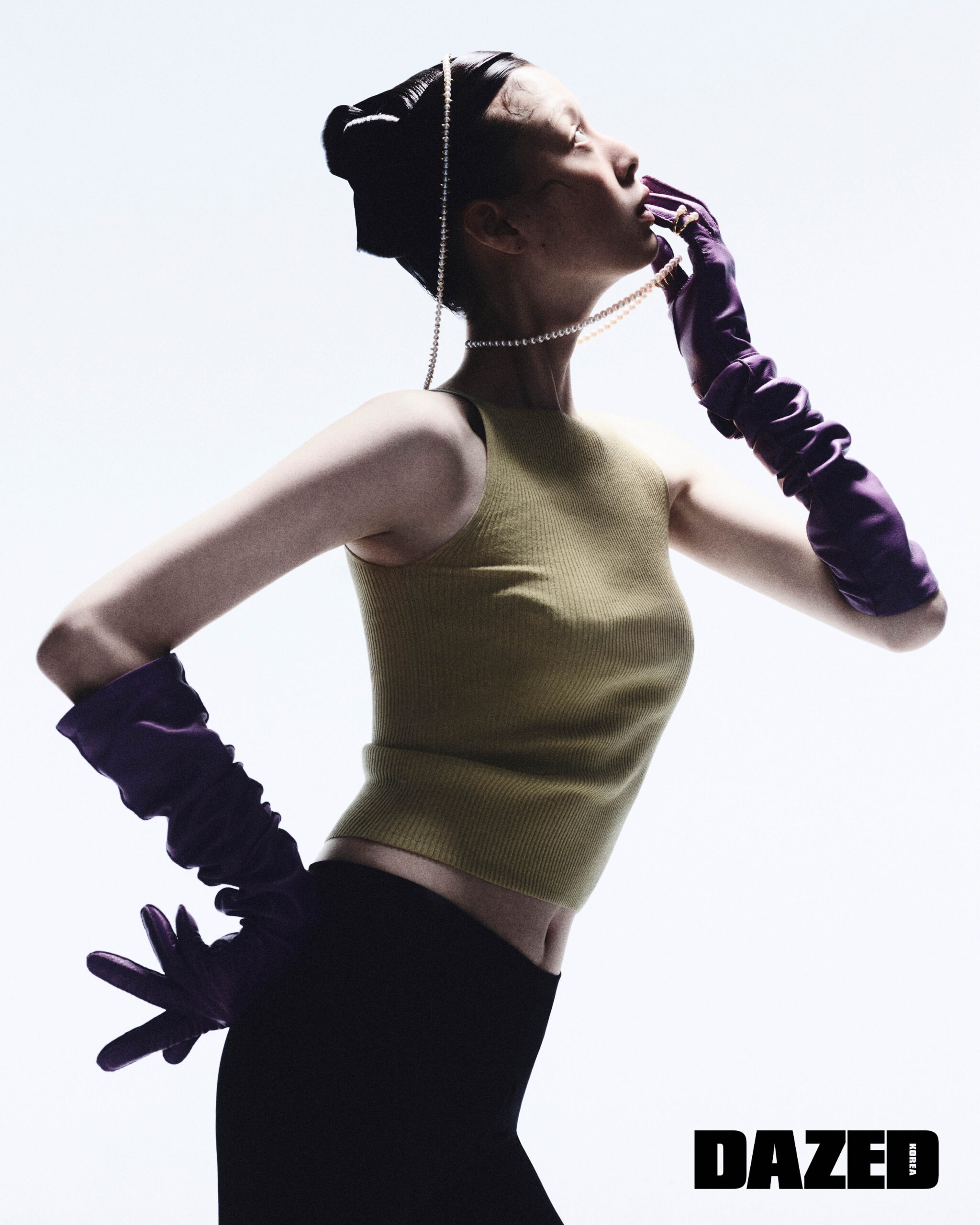 아코야 진주에 장식한 옐로 골드 소재의 가시 모티브가 돋보이는 데인저 네크리스와 데인저 팡 네크리스, 데인저 시그너처 링은 모두 타사키(Tasaki), 슬리브리스 톱은 앤아더스토리즈(& Other Stories), 스트레치 팬츠는 꾸레쥬(Courrèges), 레더 글러브는 프라다(Prada).