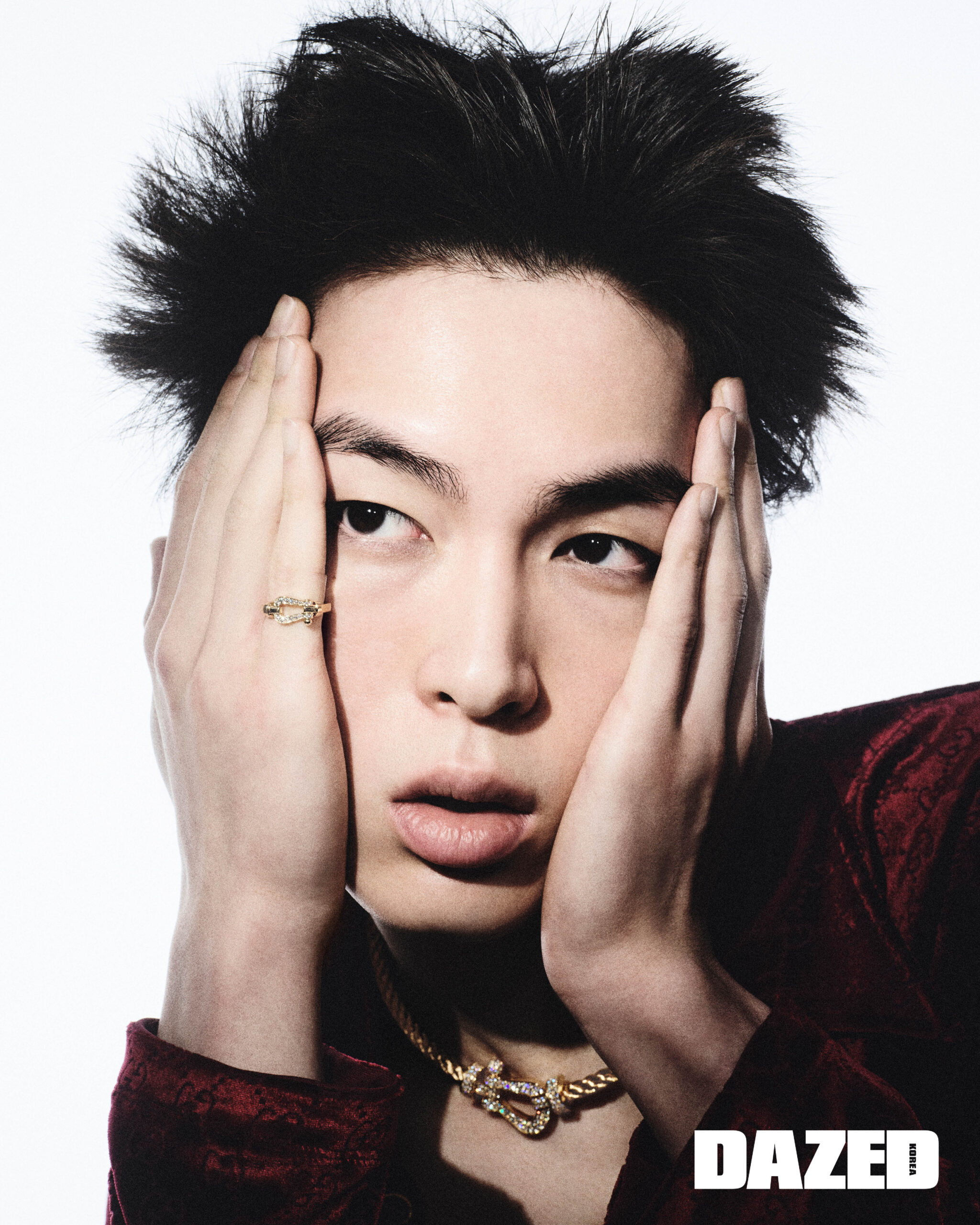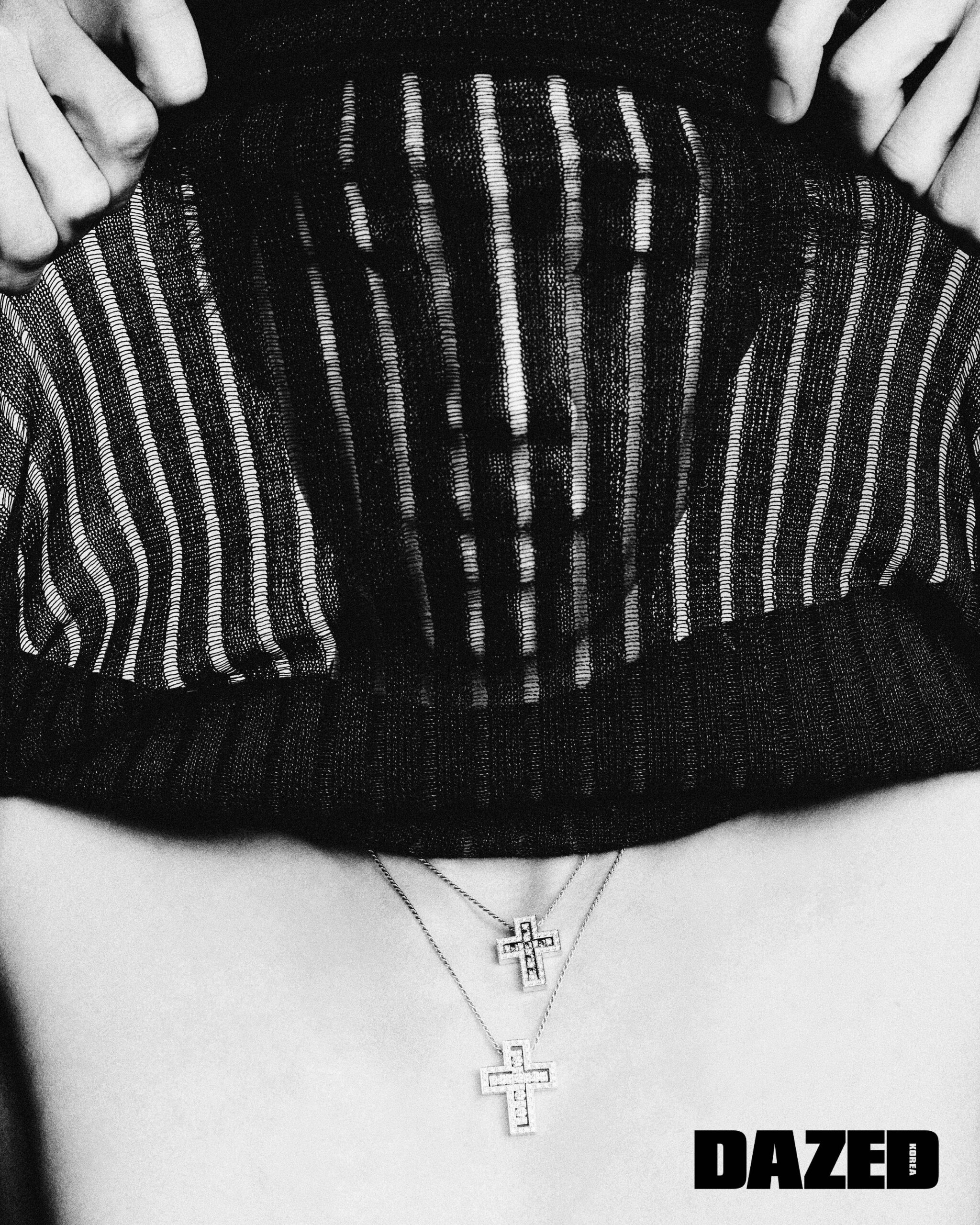 옐로 골드에 3.23캐럿의 브릴리언트 컷 다이아몬드 171개를 세팅한 포스텐 네크리스와 옐로 골드에 브릴리언트 컷 화이트 다이아몬드 20개를 세팅한 포스텐 링은 프레드(Fred), 벨벳 셔츠는 구찌(Gucci).