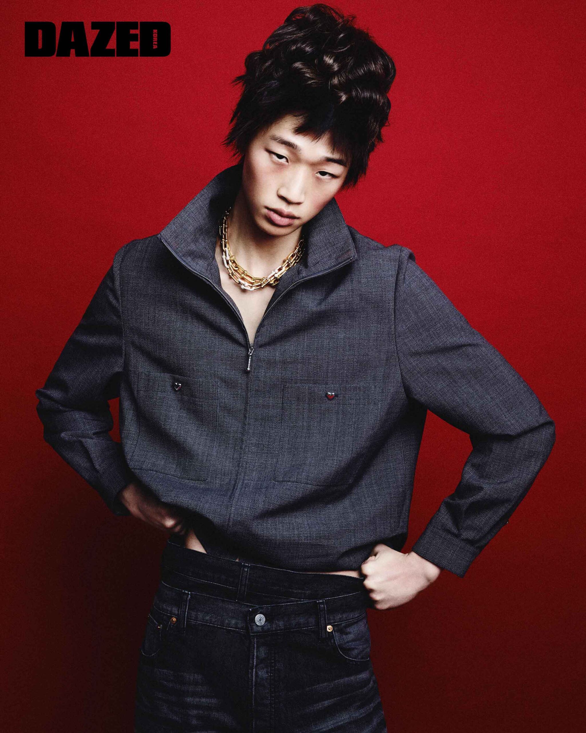 로즈 골드에 다이아몬드를 파베 세팅한 티파니 하드웨어 그래듀에이티드 링크 네크리스와 레이어드한 로즈 골드 소재의 티파니 하드웨어 그래듀에이티드 링크 네크리스는 티파니(Tiffany & Co.), 하이넥 집업 재킷은 발렌티노(Valentino), 레이어드 디테일 데님 팬츠는 준야 와타나베 맨(Junya Watanabe Man).