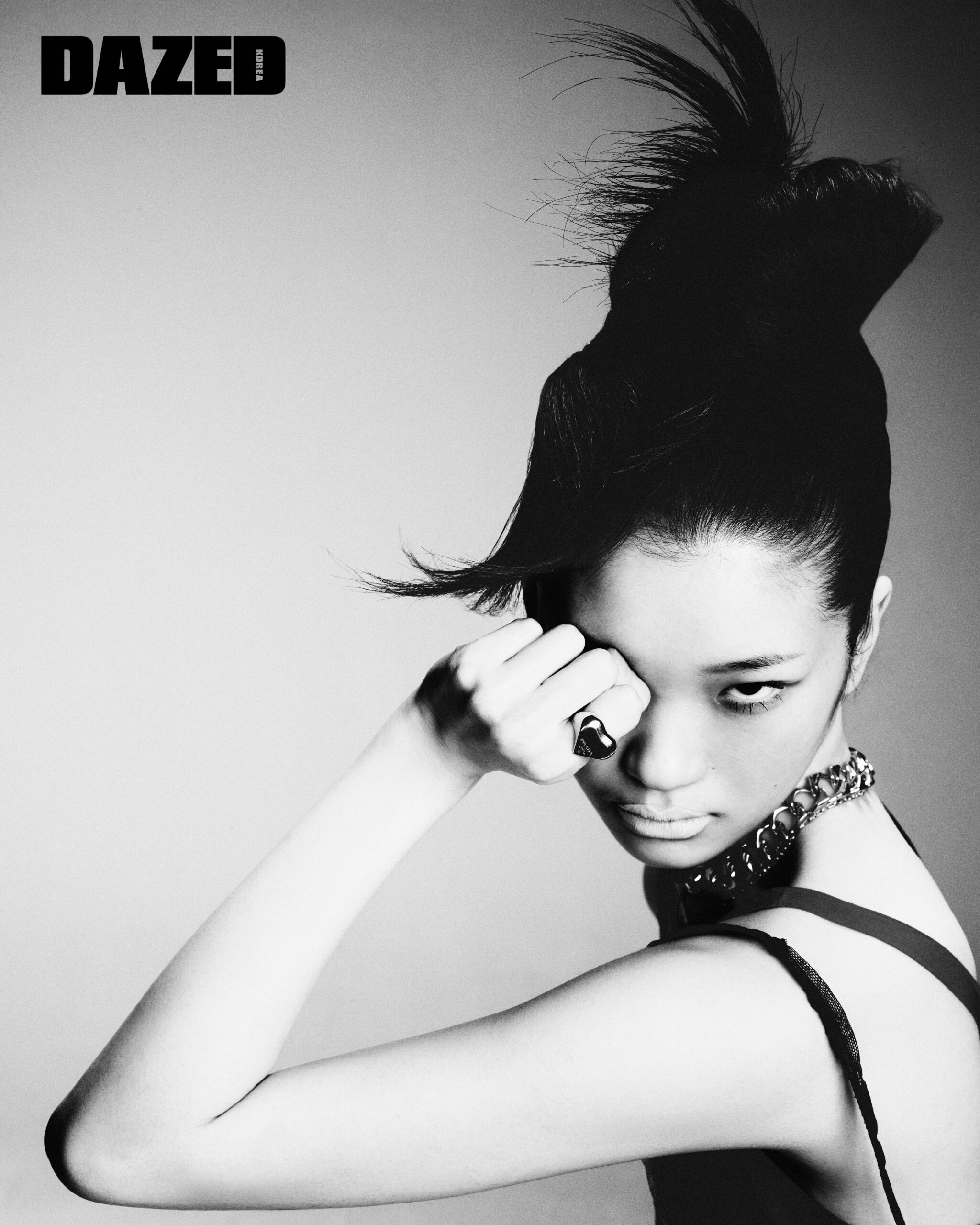 초커로 연출한 이터널 골드 브레이슬릿과 옐로 골드 소재의 이터널 골드 링은 프라다 파인 주얼리(Prada Fine Jewelry), 서스펜더 스커트와 브라톱은 프라다(Prada).