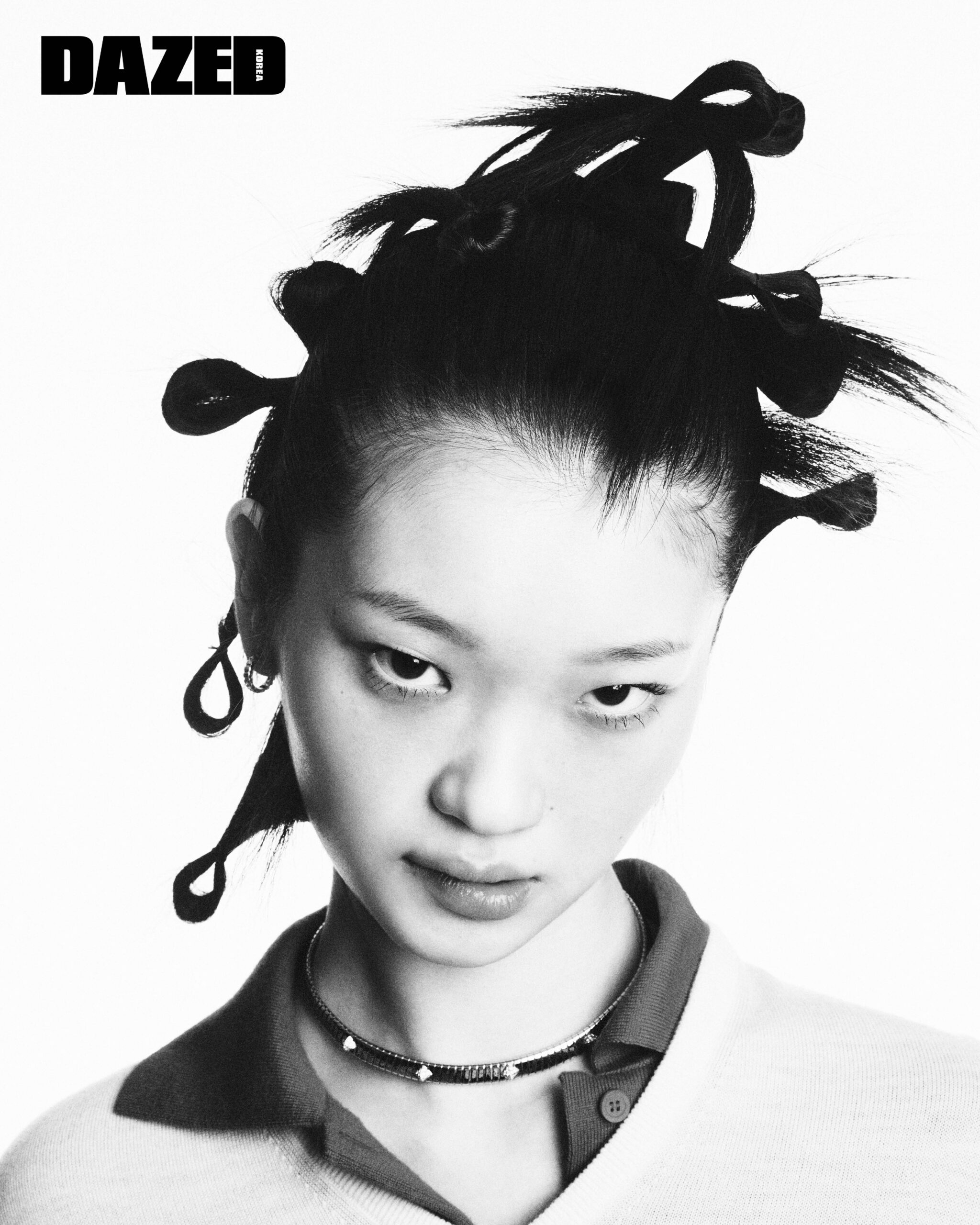 옐로 골드에 스터드 장식으로 다이아몬드를 파베 세팅한 불가리 투보가스 네크리스와 옐로 골드 소재의 불가리 투보가스 이어링은 불가리(Bvlgari), 브이넥 스웨터와 폴로 니트 톱은 로에베(Loewe).