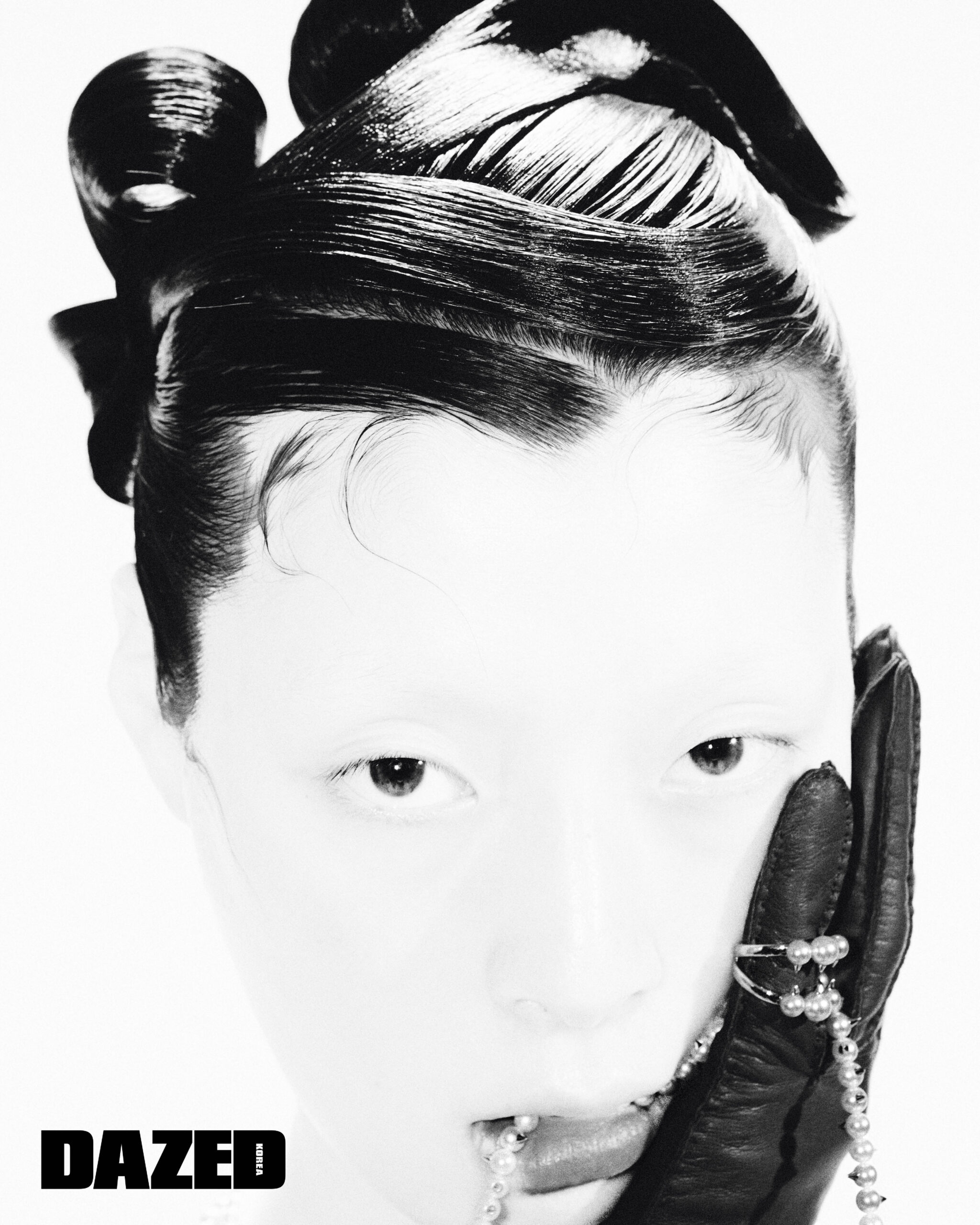아코야 진주에 장식한 옐로 골드 소재의 가시 모티브가 돋보이는 데인저 네크리스와 데인저 시그너처 링은 타사키(Tasaki), 레더 글러브는 프라다(Prada).