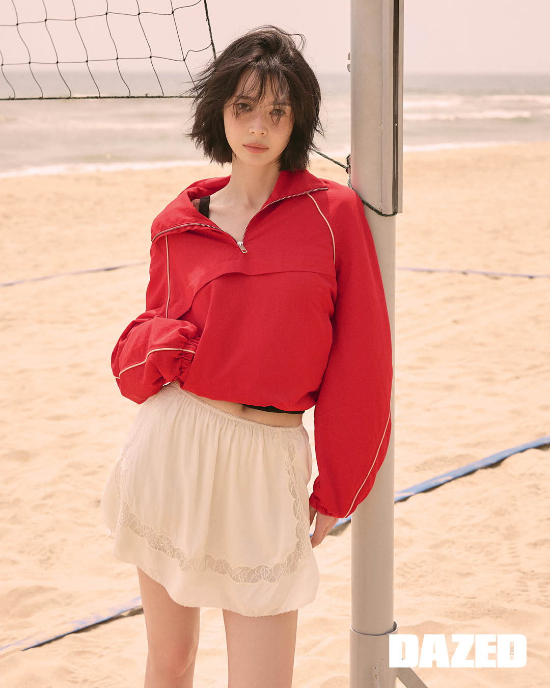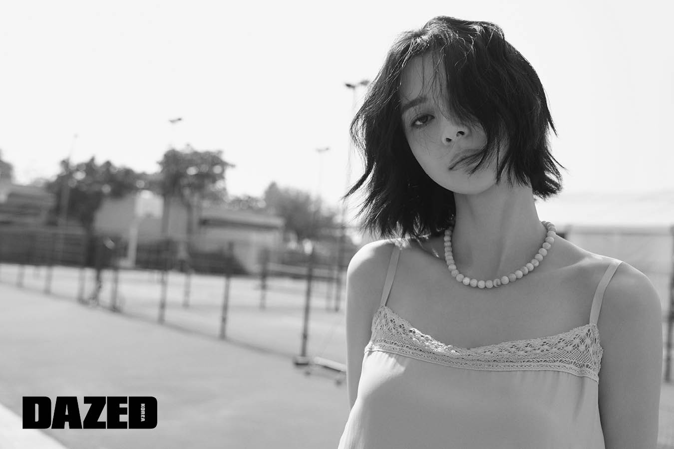 슬립 미니 드레스는 비아플레인(Viaplain), 플라워 니들 워크 나일론 쇼츠는 센토르(Centaur), 허리에 두른 화이트 티셔츠는 렉토(Recto), 스니커즈는 나이키(Nike), 원석 네크리스는 스타일리스트의 것.