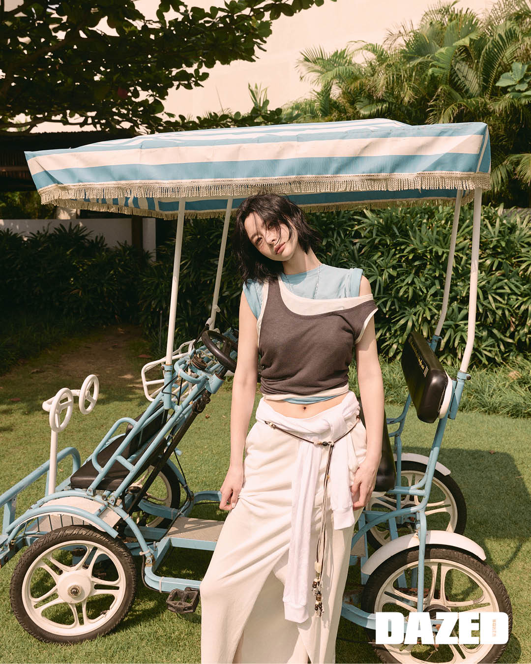 더블 레이어드 슬리브리스 톱은 솔티페블(Salty Pebble), 티셔츠는 센토르(Centaur), 티셔츠 레이어링 슬릿 스커트는 에스이오(s/e/o), 로프 벨트는 디퍼센트(Dpercent), 네크리스는 스타일리스트의 것.