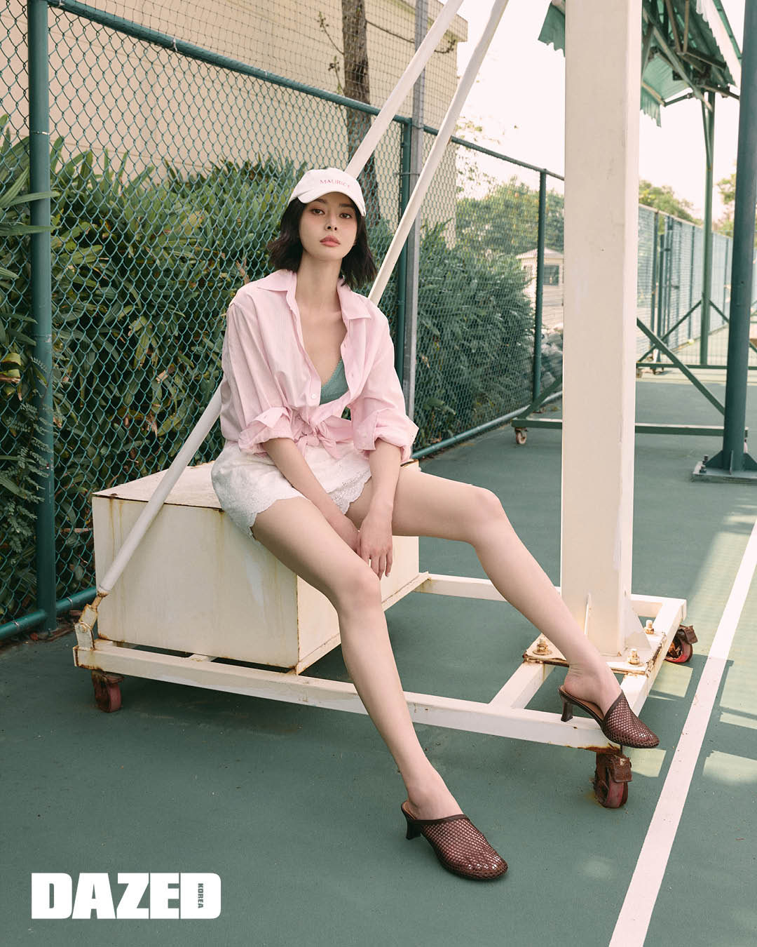 네트 소재와 볼드한 라운드 토가 돋보이는 뮬은 미소페(Misope), 핑크 스트라이프 셔츠는 쿠어(Coor), 크로셰 쇼츠는 더바넷(The Barnet), 브라톱과 볼캡은 스타일리스트의 것.