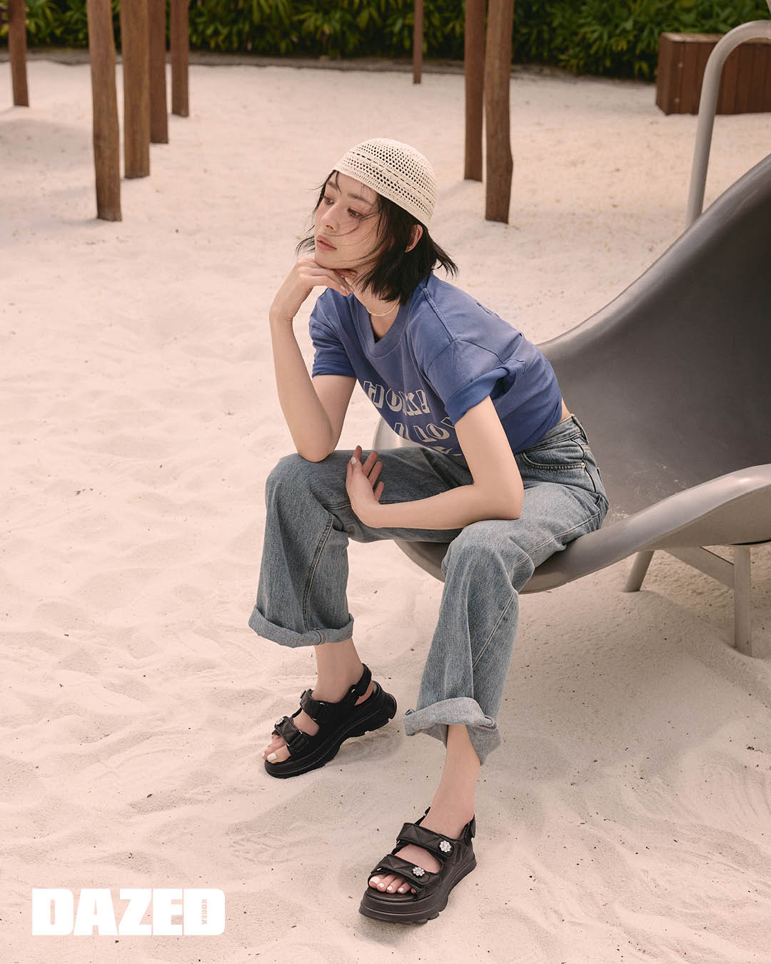 플라워 모티브의 주얼 장식이 돋보이는 스트랩 샌들은 미소페(Misope), 레터링 티셔츠는 데우스 엑스 마키나(Deus Ex Machina), 데님 팬츠는 타낫(Tannat), 네트 비니는 아모멘토(Amomento), 비즈 네크리스는 스타일리스트의 것.