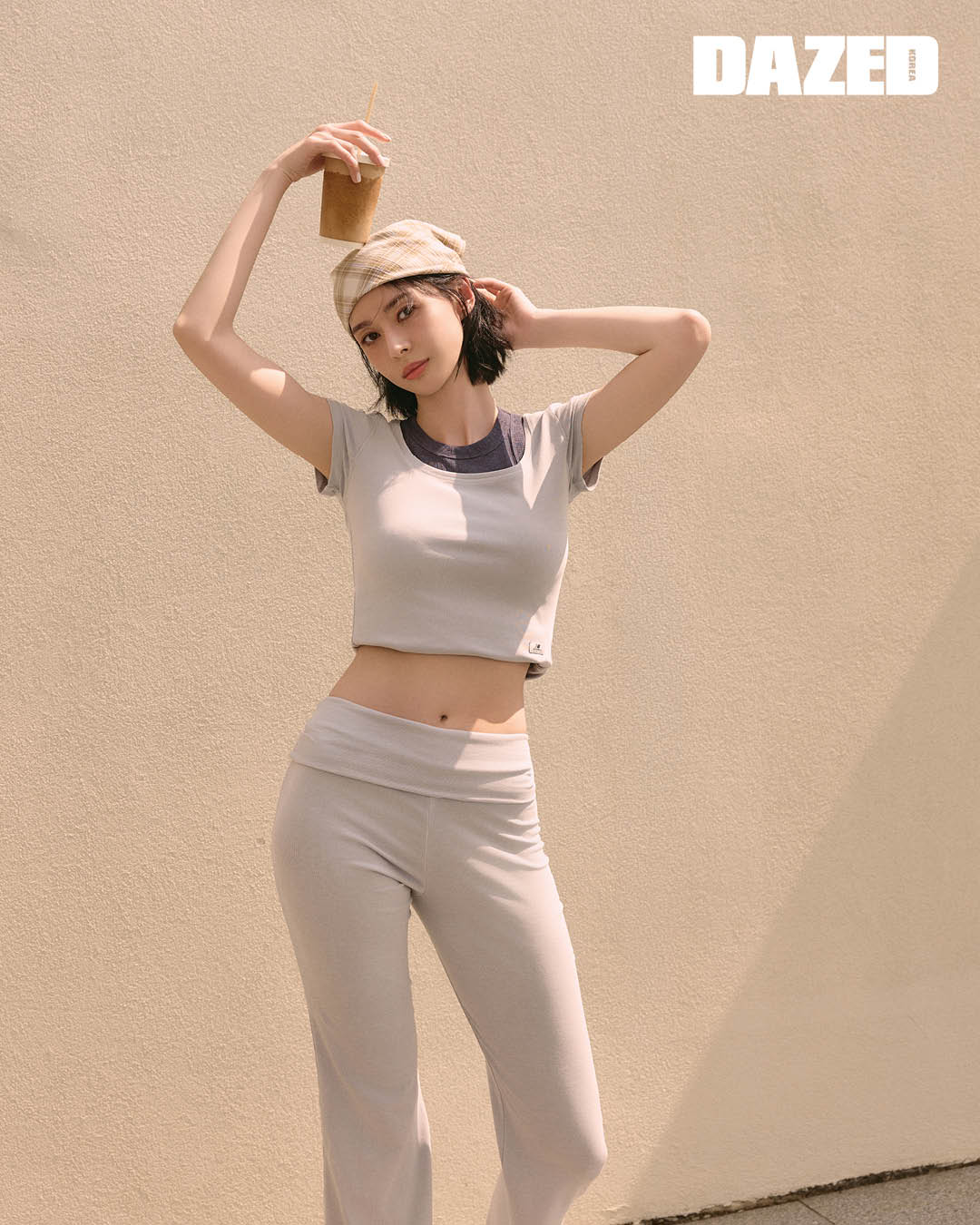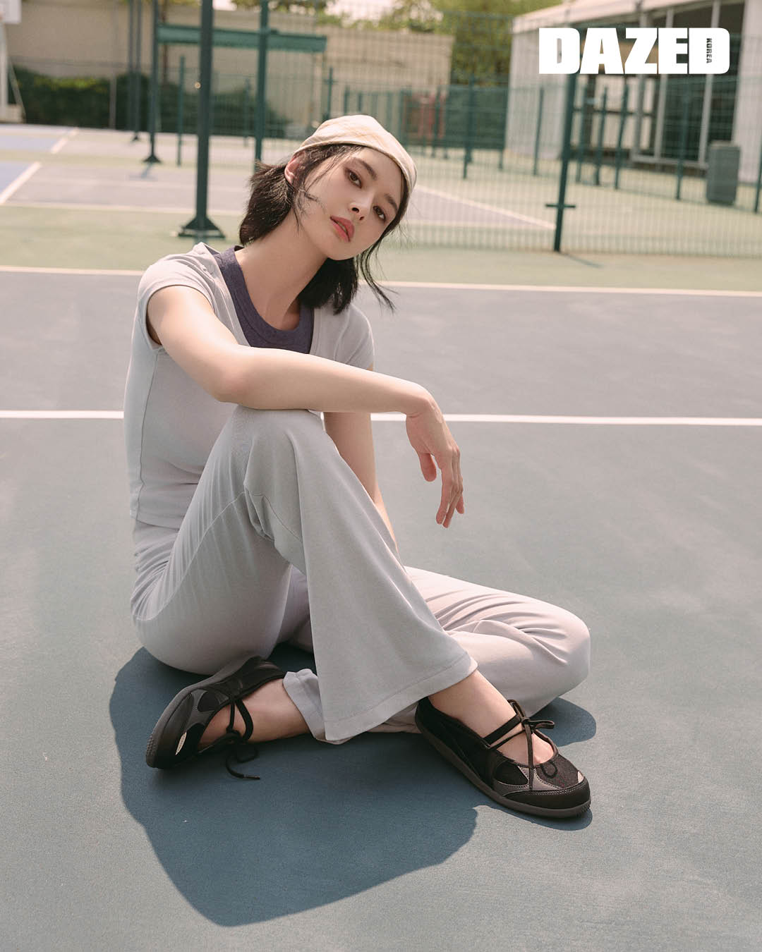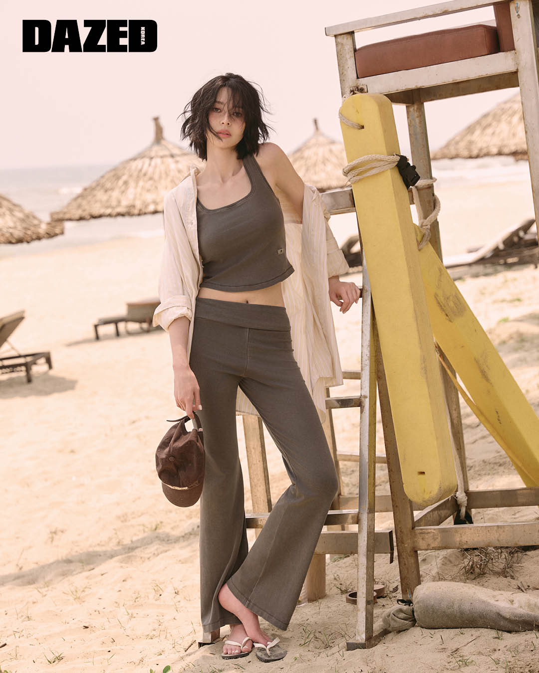 피티드 스퀘어넥 슬리브리스 톱과 피티드 폴디드 플레어 팬츠는 뉴발란스(Newbalance), 스트라이프 셔츠는 쉐르(Soeur), 볼캡과 플립플롭은 스타일리스트의 것.