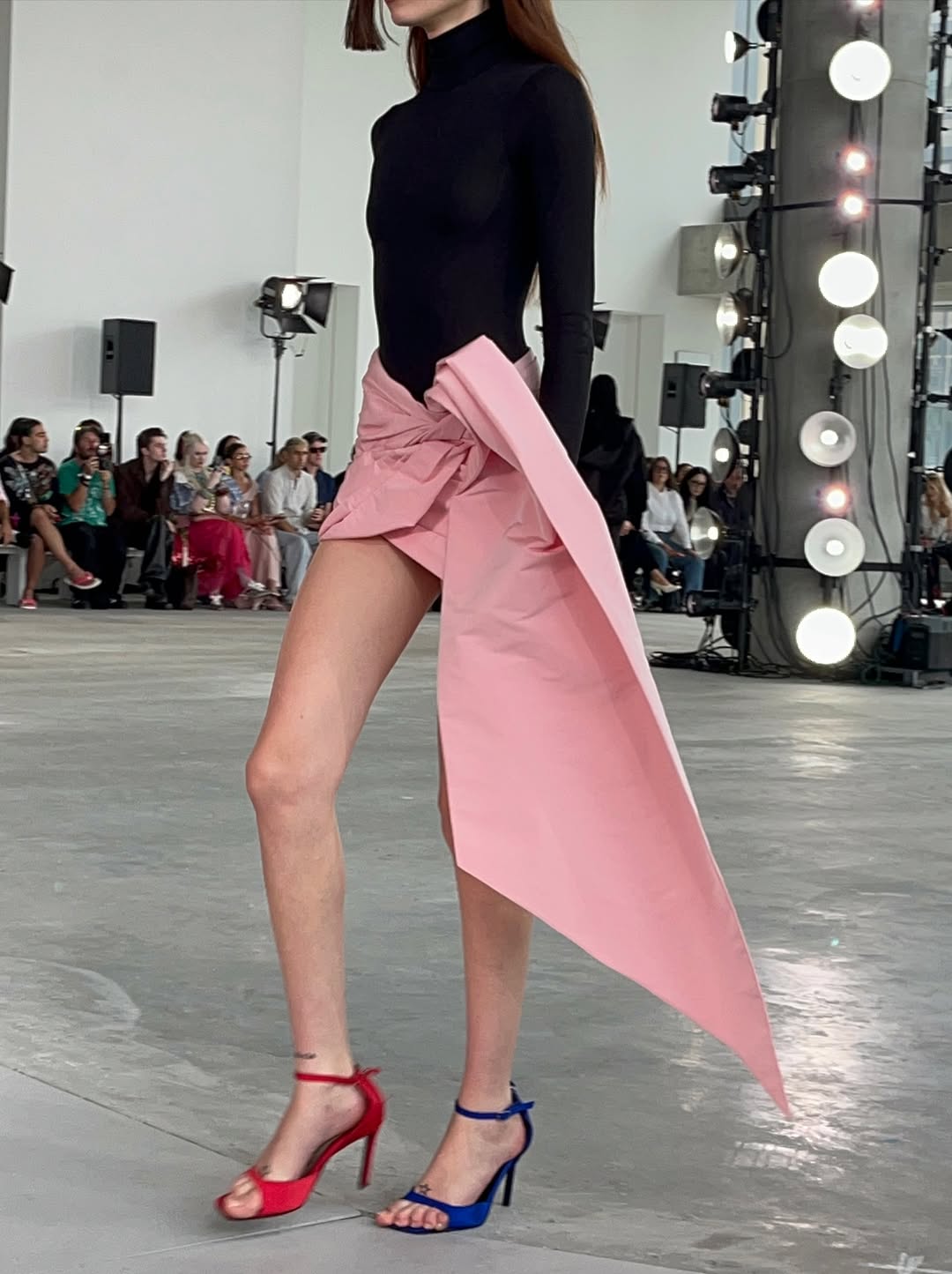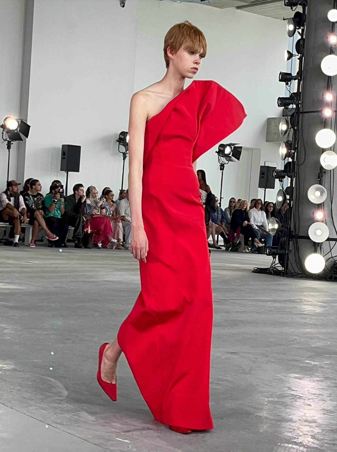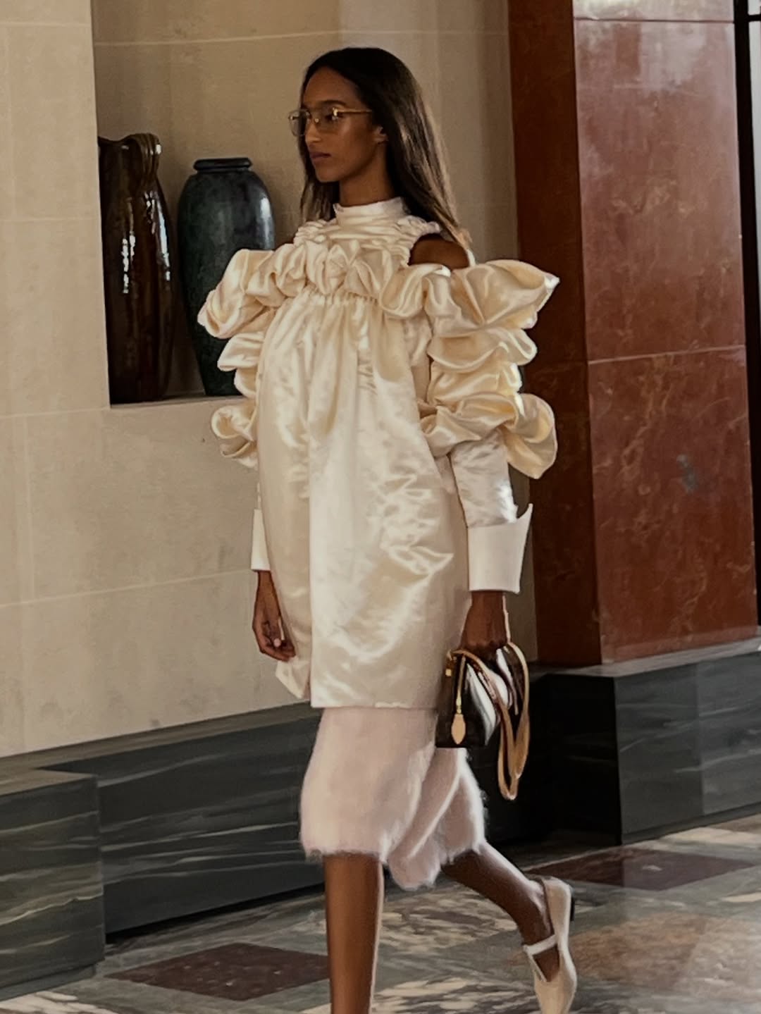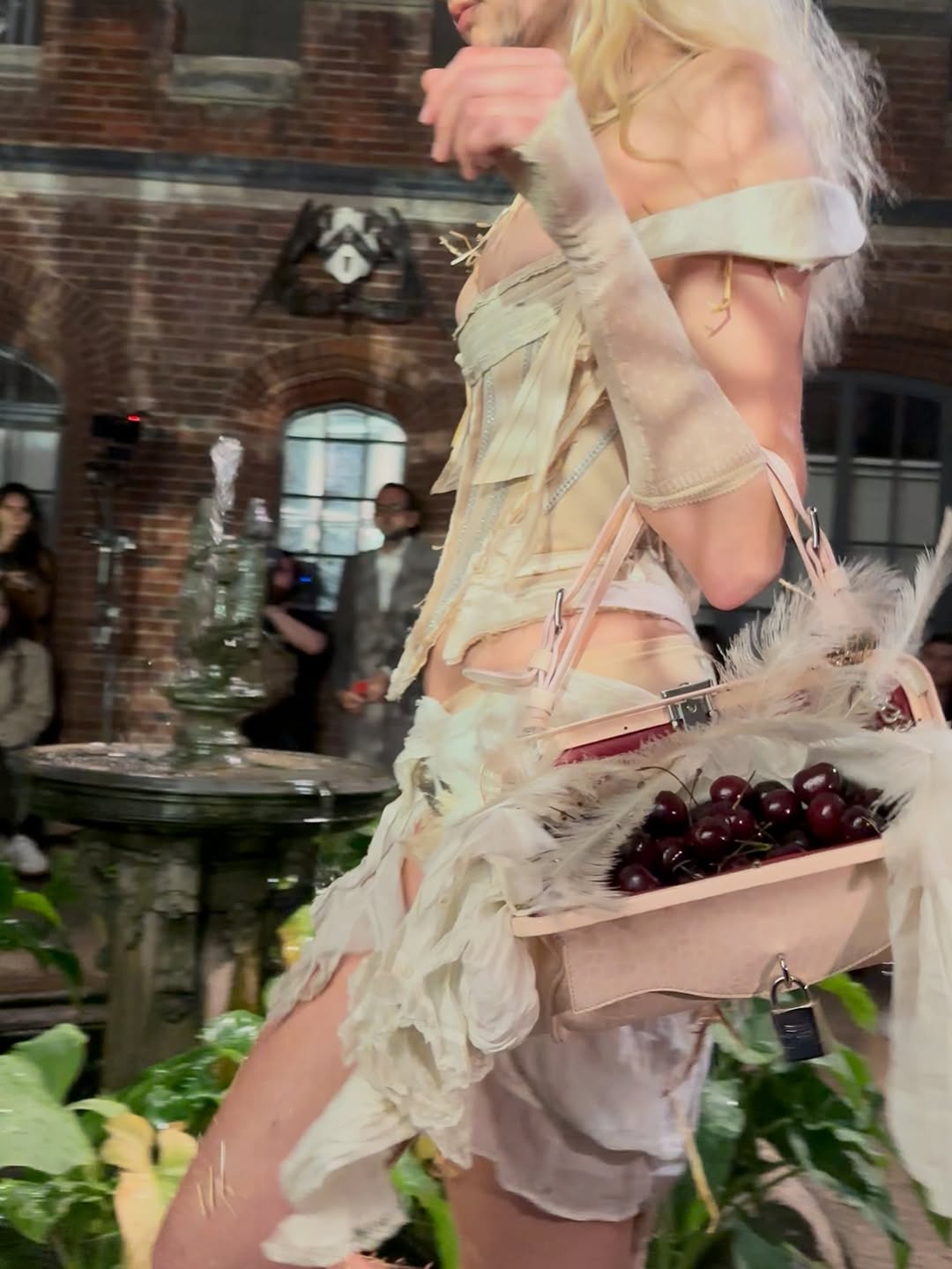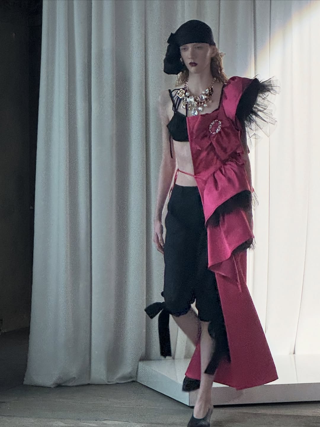 리본과 플라워 장식 등 시몬 로샤만의 로맨틱한 룩이 런웨이를 가득 채웠다. 크리놀린과 버슬로 볼륨을 강조한 스커트가 돋보였는데, 어딘가 불안정하고 삐뚤어진 듯한 실루엣이 오히려 특별하게 느껴진다. 서로 어울릴 것 같지 않은 오간자, 시퀸, PVC 같은 소재들이 뒤섞이며 기묘한 조화를 이룬다. 베개를 꼭 안은 모델의 모습, 리본 사이에 꽂힌 꽃, 꽃잎을 뒤집어 쓴 듯한 트래퍼 해트는 낭만을 품었다.