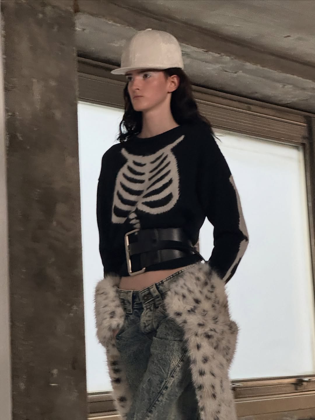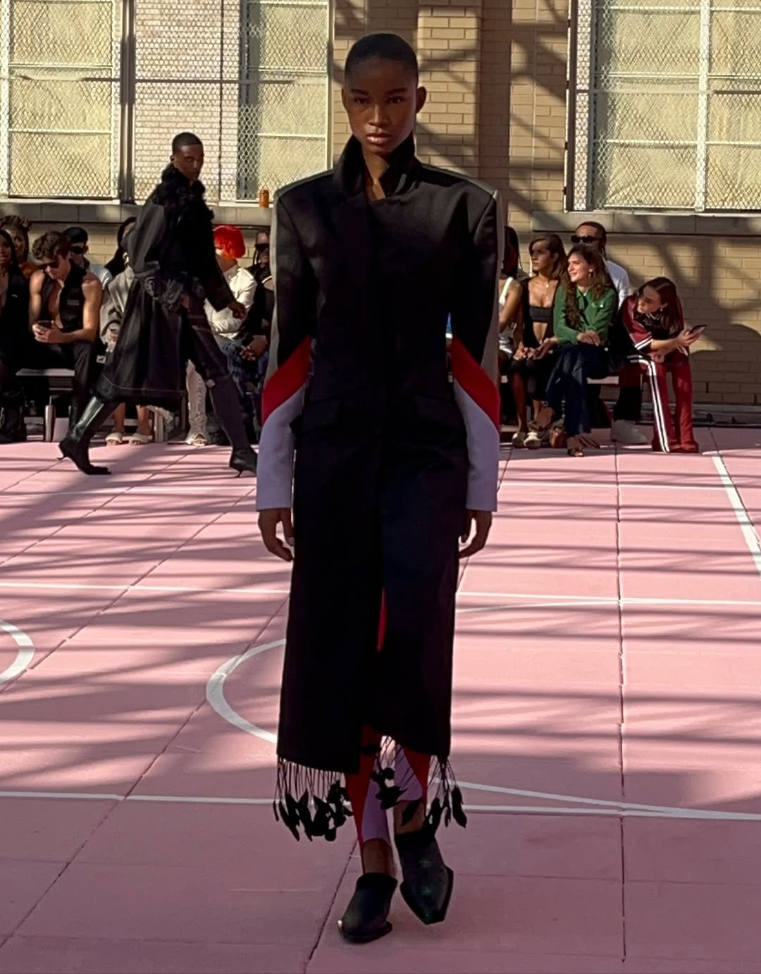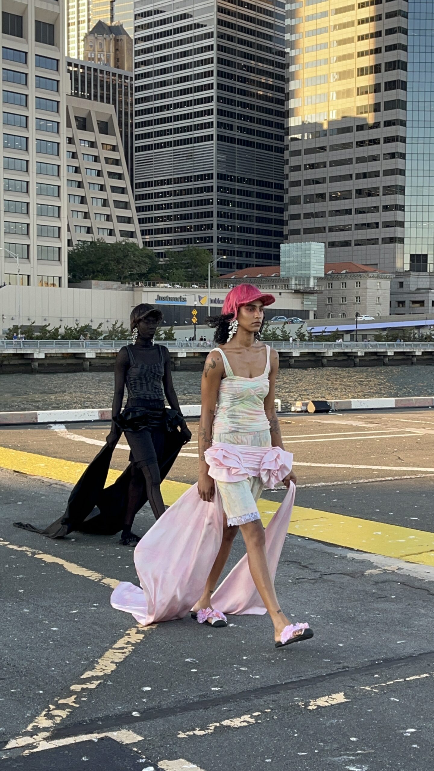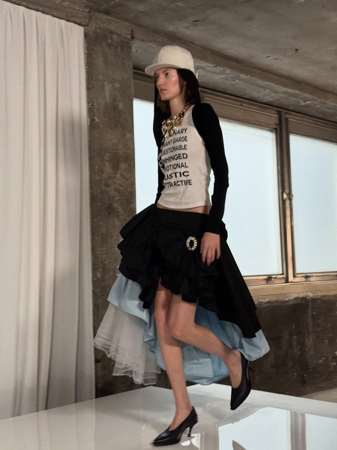 콜리나 스트라다는 또 한 번 장난스럽지만 묘하게 심오한 방식으로 우리를 사로잡았다. 2026년 봄/여름 컬렉션은 황금빛으로 물드는 이스트 리버와 구름 한 점 없는 하늘을 배경으로 모델들이 등장하며 막을 열었다. 혼자가 아닌, 각자 짝을 이뤄 런웨이를 걸었고, 개중에 ‘그림자’처럼 온몸을 뒤덮는 블랙 시스루 보디수트로 페이스를 가린 모델들도 존재했다. 이 듀오 런웨이는 빛과 어둠, 가벼움과 무거움, 희망과 불안을 병치하는 방식으로 보였고, 콜리나 스트라다가 늘 해왔던 ‘지금 이 시대의 혼란을 입는 법’을 묻는 제스처 같았다. 옷은 풍성하고 유머러스했지만, 두 개의 실루엣이 겹쳐지는 장면은 오히려 묵직한 울림을 남겼다. 결국 이 쇼는 아름다운 황혼의 풍경만큼이나 이중적이었다. 자유분방하고 유쾌하면서도, 동시에 그림자 같은 진실을 마주하게 만드는 것. 쇼의 피날레에서 힐러리 테이무어는 그 경계 위를 또렷하게 걸었다.