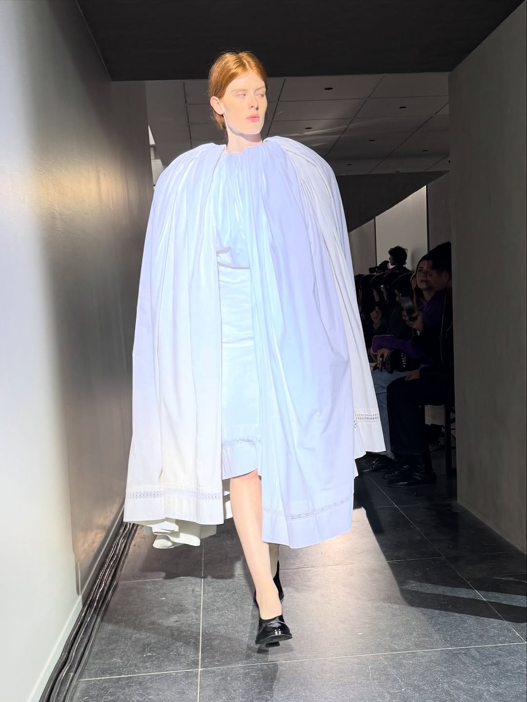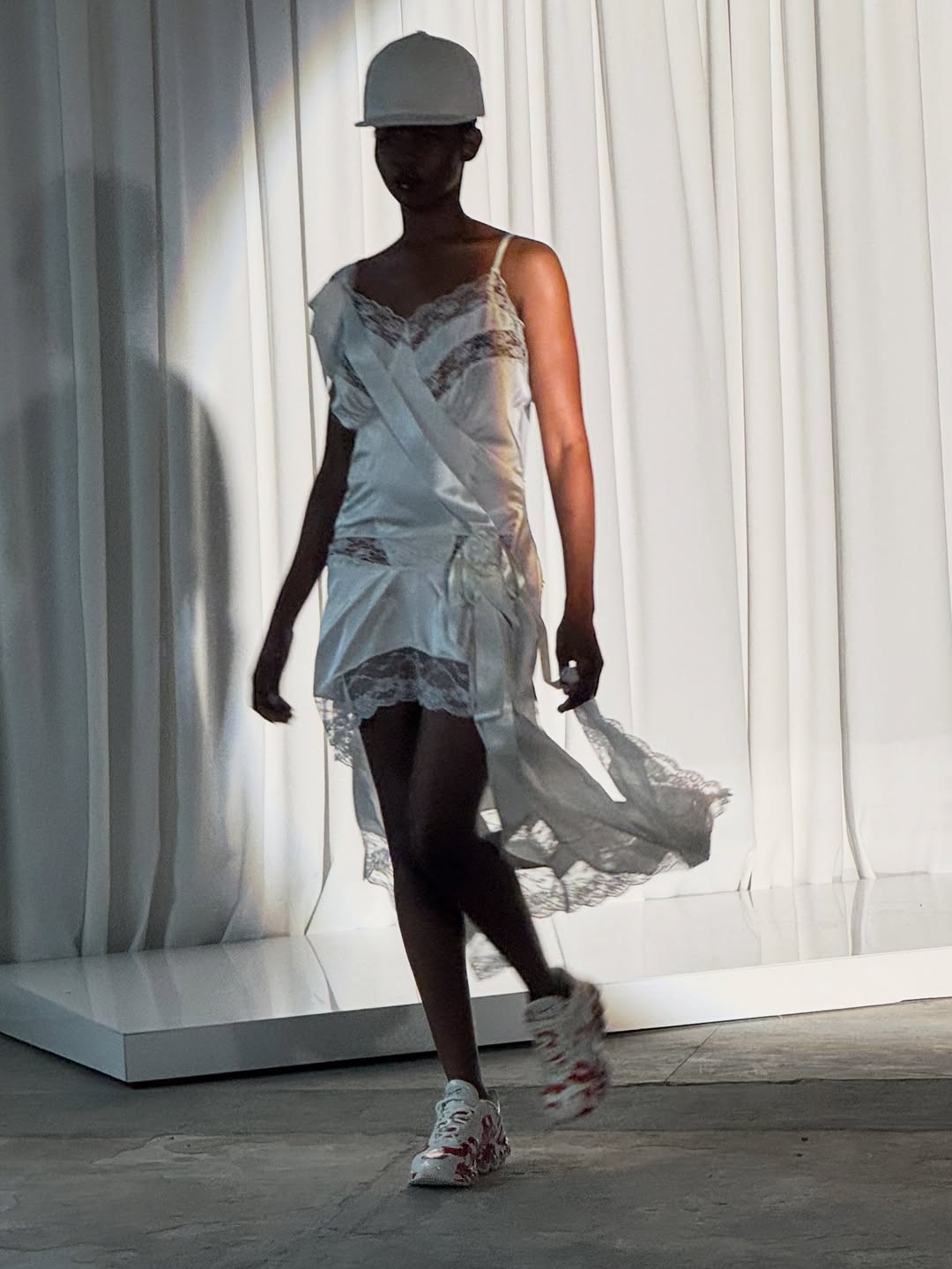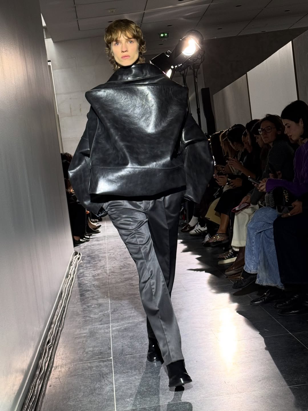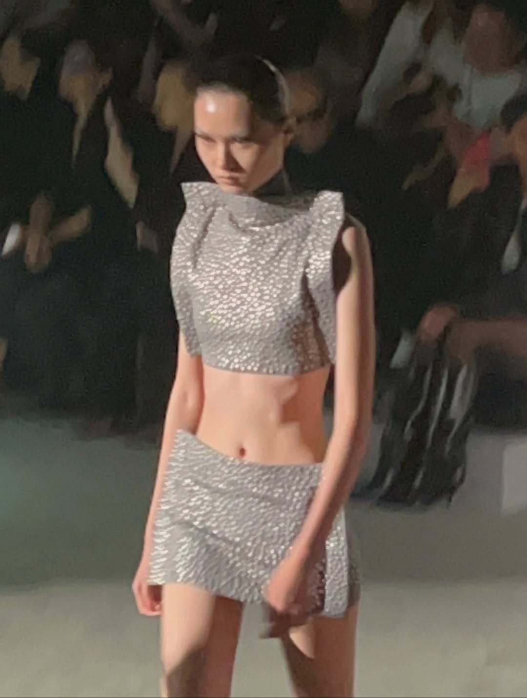 마크 뉴슨이 디자인한 무대는 마치 픽셀화된 로마의 거리처럼 보였다. 낯설면서도 익숙하고, 차갑지만 동시에 따뜻했다. 그 사이를 지나가는 옷들은 한순간 무너질 듯 가볍고, 또렷하게 자기 자리에서 버텼다. 지퍼와 드로스트링이 달린 재킷은 스포츠웨어 같았고, 동시에 밤에 피는 꽃처럼 은밀한 우아함을 가졌다.