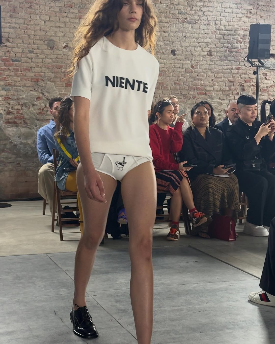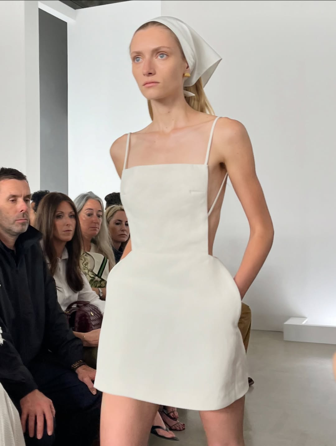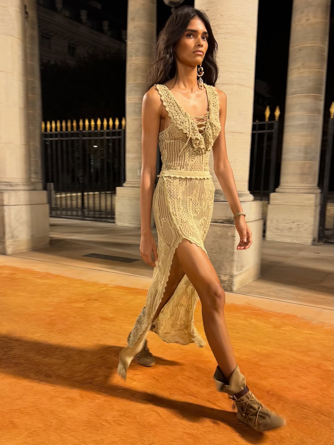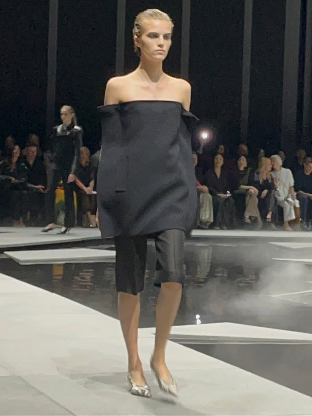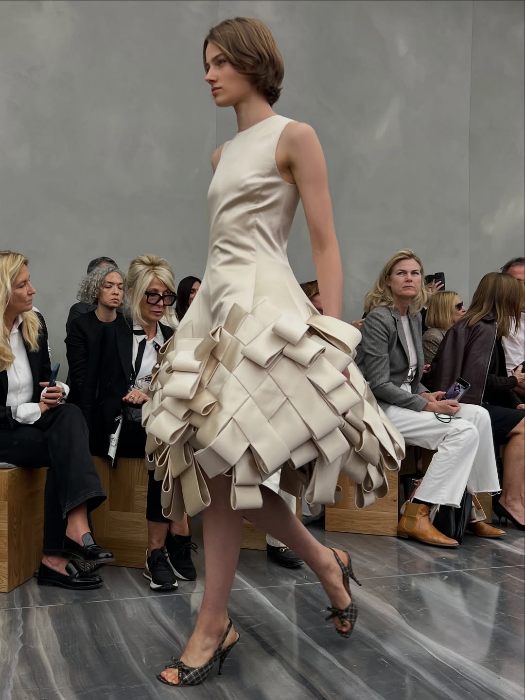 마크 뉴슨이 디자인한 무대는 마치 픽셀화된 로마의 거리처럼 보였다. 낯설면서도 익숙하고, 차갑지만 동시에 따뜻했다. 그 사이를 지나가는 옷들은 한순간 무너질 듯 가볍고, 또렷하게 자기 자리에서 버텼다. 지퍼와 드로스트링이 달린 재킷은 스포츠웨어 같았고, 동시에 밤에 피는 꽃처럼 은밀한 우아함을 가졌다.