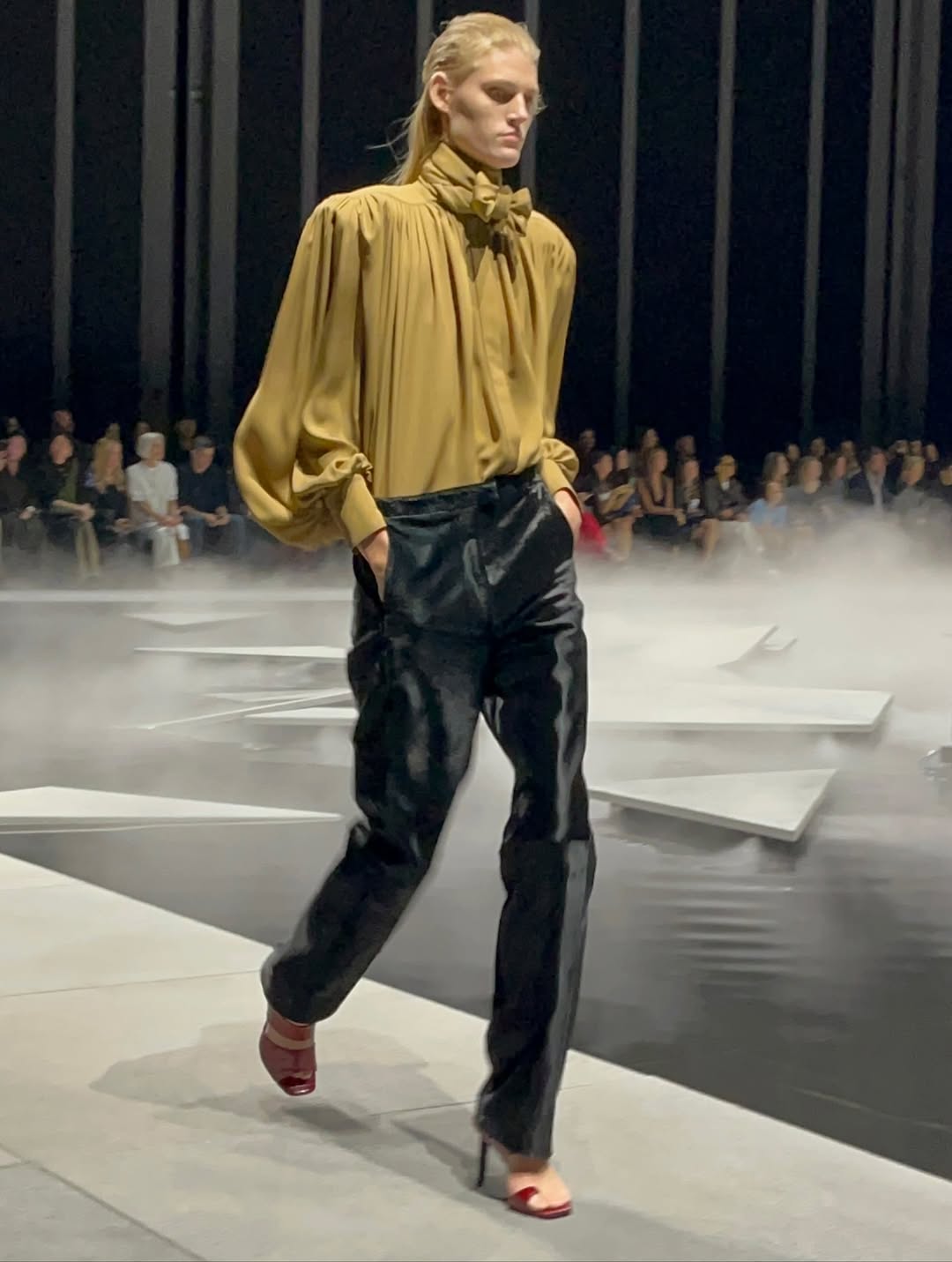 생 로랑의 여성은 영웅이다. 검은 가죽 속에서 날카롭게 빛을 뿜어내던 실루엣은 시간이 흐를수록 점점 더 슬림하고 타이트해진다. 이어 얇디얇은 나일론 드레스가 나타나고, 마침내 바람을 머금고 부풀어 오른다. 에펠탑의 불빛은 밤하늘에 흩어지고, 얼굴을 가릴 만큼 커다란 이어링은 그 빛을 받아 눈부시게 반짝인다. 모든 것이 아찔할 만큼 선명하게.