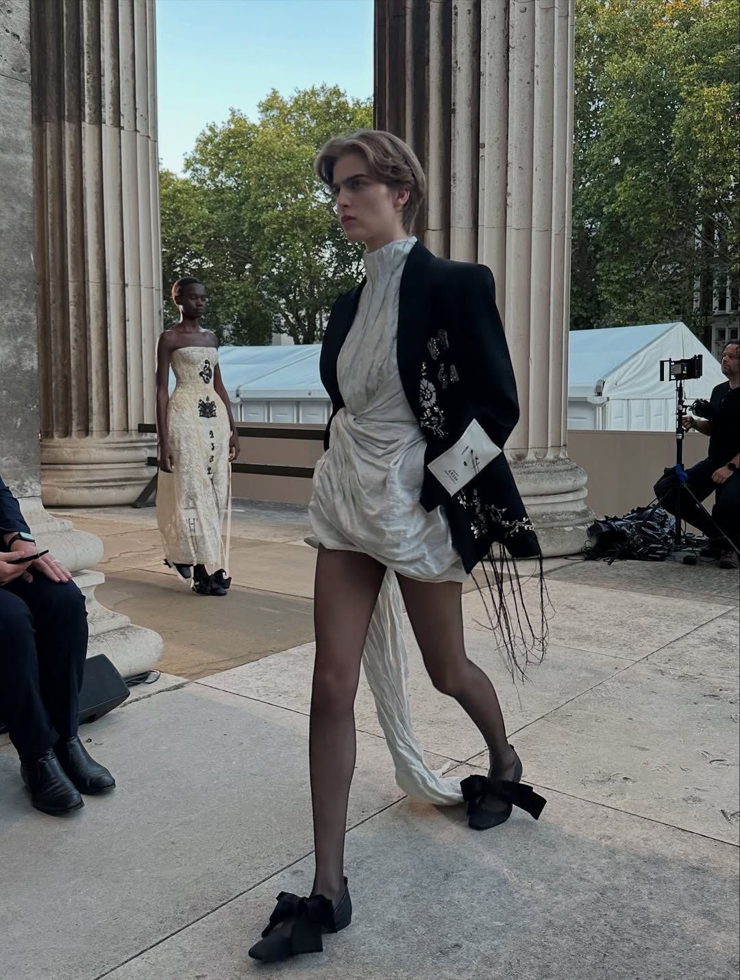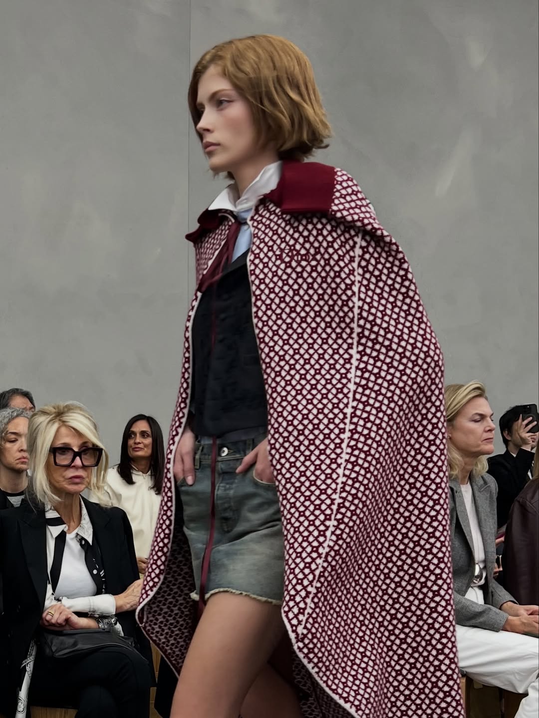 짙은 안개와 검은 물 위를 가로지른 케이트의 2026년 봄/여름 컬렉션은 영화의 한 장면처럼, 현실과 환영의 경계 위를 걷는 듯 했다. 크리에이티브 디렉터 캐서린 홀스테인은 다양한 실루엣의 볼레로와 칵테일 드레스, 그리고 시그너처 백과 슈즈로 다시 한번 입지를 공고히 했다. 길게 늘어진 피셔맨 레더 재킷과 도시적 무드를 담은 더블브레스트 레더 재킷. 동시에 시스루 드레스와 봄꽃이 만개한 듯한 자수 블라우스가 어우러졌다. 레더와 시스루, 거친 것과 여린 것이 서로 공존하는 무대였다. 과장된 턴업 밑단의 데님 팬츠와 도트 블라우스, 그리고 켄달 제너가 입은 시스루 도트 스커트 역시 이번 시즌 트렌드의 서막을 알리는 듯한 장면으로 남았다.