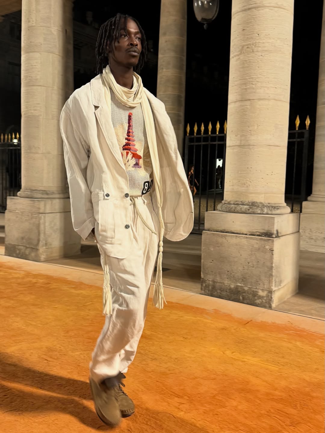 투명한 오간자 위로 스포트라이트가 부드럽게 흘렀다. 샤워 커튼 같기도 하고, 꿈속에서 본 얇은 막 같기도 했다. 타월링 재킷과 미러 가죽이 차례로 나타났는데, 거울 같은 표면은 마음속 작은 의심과 두려움을 은근히 비추는 것 같았다. 컬러는 과거에서 왔다. 선명한 오렌지와 블루는 테니스 코트의 오래된 페인트 자국 같았고, 라코스테 그린은 여름날의 풀 냄새처럼 은근하게 스며들었다.